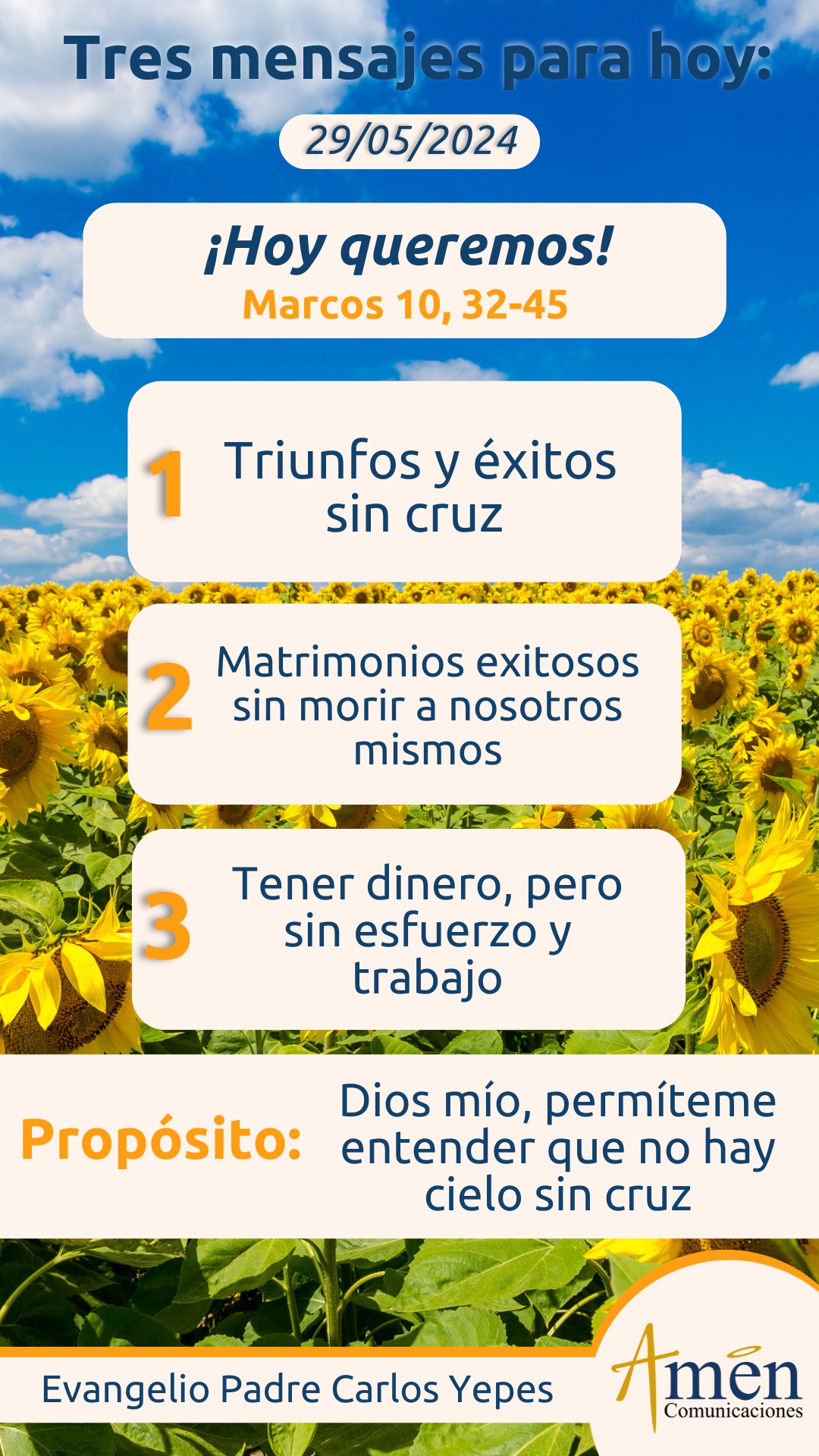 Hoy, dos mil años después, somos un poco Juan, somos un poco Santiago; queremos los triunfos, los éxitos, pero no queremos saber de sacrificios, exigencias, cruz, compromisos. Quisiéramos el disfrute de la vida matrimonial, la vida en pareja, la vida acompañados, la vida apoyados, pero no queremos saber de la cruz propia de la convivencia que nos lleva a morir a nosotros mismos, a ser pacientes, a ponernos empática y comprensivamente en el lugar de la pareja, de la otra persona. Queremos ser ricos, pero no queremos trabajar, ni sacrificarnos, ni esforzarnos demasiado por conseguir una holgura, una seguridad material y económica. Queremos ser conocidos y reconocidos, pero a veces desde la frivolidad del mundo, haciendo un poco de show, buscando la fama, pero no ser conocidos y reconocidos por el servicio, el amor y la entrega a los demás.