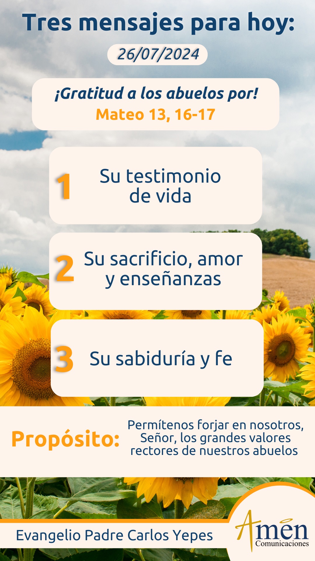 Nos apartamos del texto bíblico que nos propone la liturgia de la Iglesia, para optar por otro texto precioso que también la Iglesia sugiere como memoria obligatoria, a propósito de san Joaquín y santa Ana, padres de la Santísima Virgen María, y a propósito de que el domingo más cercano a esta fiesta, el último domingo de julio, el Papa ha convocado la Jornada mundial de los abuelos y los adultos mayores. Caen como pedrada en ojo, la primera lectura tomada del Eclesiástico o el libro del Sirácida en el capítulo 44, cuando nos invita a ser un elogio de aquellos hombres y mujeres ilustres, ancestros nuestros, antepasados de cada uno de nosotros, que brillaron por sus obras, por su misericordia, por su ejemplo de vida. Nos dirá el libro del Eclesiástico en este capítulo 44, que su herencia eterna se perpetúa en sus descendientes, hijos y nietos, y que ellos seguirán siendo fieles a la gran alianza con Dios, por eso su gloria, su reconocimiento, la luz de sus vidas jamás se extinguirá.