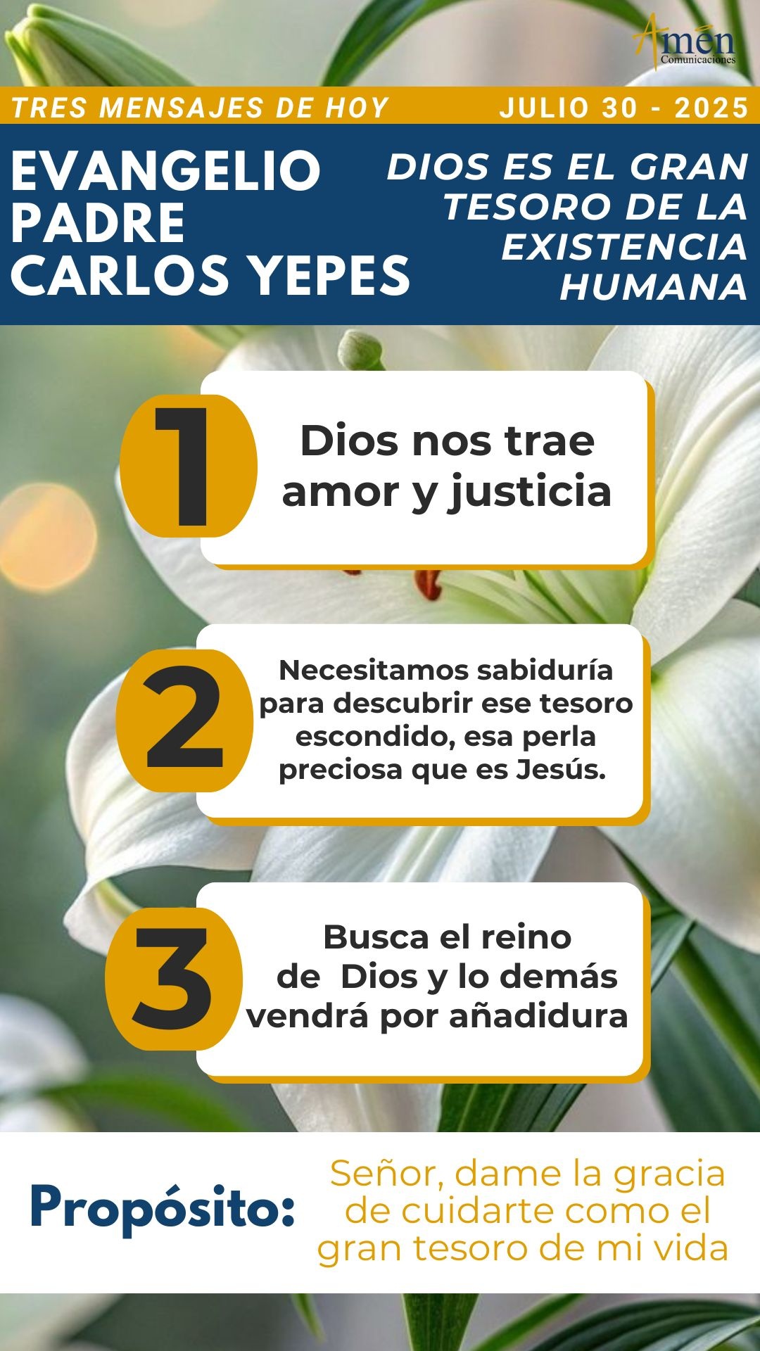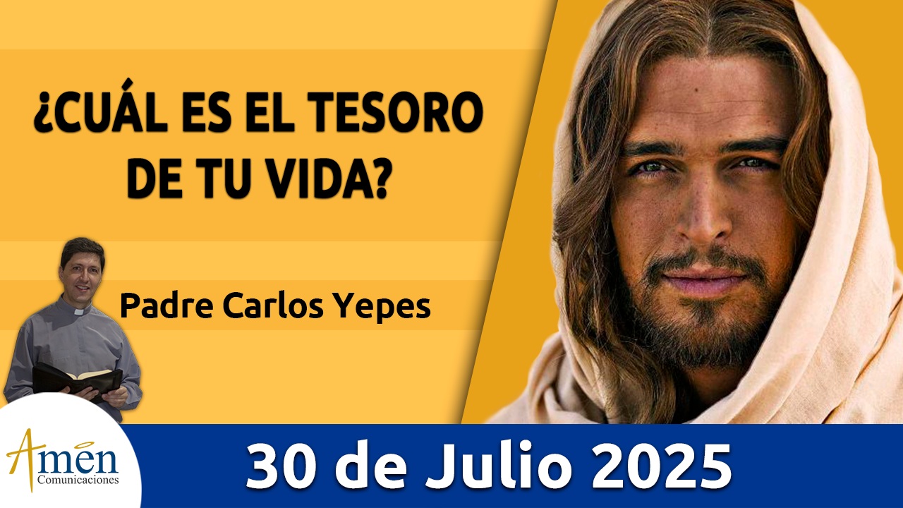 TRANSLITERACIÓN REFLEXIÓN PADRE CARLOS YEPES ¿Cuál es el tesoro de tu vida? A propósito del discurso parabólico de san Mateo, capítulo 13, donde se nos habla “del Reino de los cielos como un tesoro escondido o como una perla de gran valor”. Aprendamos tres enseñanzas para nuestra vida. La primera, Dios y su proyecto de justicia y de amor para el mundo es el gran tesoro, la perla de gran valor; no hay nada más grande en esta tierra por lo cual valga la pena gastar la vida y luchar. Cuando encontramos que en el mundo se nos ofrecen tantos proyectos de felicidad, de plenitud, de falsos tesoros, descubramos que todo en esta tierra tiene el sello de lo efímero, lo pasajero, lo temporal. El único que permanece es Dios, y aunque no lo podamos ver con los ojos sensibles, sentimos en lo profundo de nuestra alma espiritual que la justicia, el amor, el proyecto de paz y reconciliación que Él nos propone, hace que la vida valga la pena, tenga sentido, sea valiosa, hace que la vida sea en colores para cada uno de nosotros. Pero hay una segunda enseñanza que nos propone el evangelio de hoy. Necesitamos sabiduría para descubrir ese tesoro escondido, enterrado bajo tierra. Necesitamos sabiduría para reconocer esa perla valiosa, no está a primer golpe de vista encontrar o reconocer el gran tesoro del reinar de Dios, de la bendición de Dios, del amor de Dios en nuestra vida, si no tenemos un esfuerzo de ser buscadores de tesoros como en las películas de Hollywood, o de ser comerciantes en perlas finas, avezados, experimentados que saben distinguir la perla de gran valor de la que sencillamente es falsa. Hoy pregúntate ¿cuáles son los grandes tesoros de tu vida?, ¿qué te mueve a madrugar, a trabajar, a sacrificarte?; ¿una persona, y esa persona si vale la pena?, ¿un trabajo, y ese trabajo si es definitivo?, ¿unos bienes materiales, y te irás con ellos más allá de la muerte? Nunca olvidemos, a propósito de los tesoros del mundo “que pasan porque los carcome la polilla o los roba el ladrón”, (como nos señala el mismo evangelio). O también en otro pasaje bíblico se nos dice: “Que no podemos servir simultáneamente al Dios del cielo, al Dios amor y al dios de la tierra, al dios dinero”, (o como se le conoce bíblicamente el dios mammón). Tú en tu corazón, frente a esta pregunta muy honesta que te puedes hacer, a ¿quién sirvo yo en mi vida?, ¿quién es lo más o qué es lo más importante en mi existencia? Apunta a lo más alto, ¿aquella persona vale la pena?, ¿esta empresa?, claro que sí, ¿esta seguridad material?, claro que sí; pero más grande que todo esto como proyecto definitivo de tu vida, no pierdas a Dios en el horizonte de tu existencia. Finalmente, en una tercera y última enseñanza, nos dice el evangelio: “Que aquel hombre, buscador de tesoros, o aquel comerciante experto en perlas finas, finísimas y exóticas, venden lo que tienen, (podríamos decir, lo dejan, lo relativizan y lo hacen sin dolor, otros pequeños tesorillos en su vida, otras pequeñas perlas de colección). Y dejan todo esto con gran alegría para poder acceder al gran tesoro que es Dios en nuestro corazón”. Con razón los místicos, que fueron buscadores de tesoros, con razón los santos expertos en la perla de gran valor nos muestran “que todo fuera de Cristo es estrecho”, (como dice san Juan de la Cruz), o “que el amor de Dios no cansa, ni se cansa”, (como repite este místico español). Hoy descubre que a veces te has afanado, te has apurado por tantas cosas que no lo negamos dan una seguridad material, dan una comodidad, un bienestar; pero no son capaces de plenificar, plenificar totalmente tu vida. Busca el Reino de Dios, busca la justicia, el amor, la paz, el perdón en las relaciones humanas que trae ese Reino, un nuevo mundo, un nuevo orden mundial. Y lo demás, el pan de cada día y los tesorillos que a veces nos afanan, vendrán por añadidura. Dale a Dios el primer lugar en tu corazón, te lo aseguro, al final de tu vida no te arrepentirás. Que el Señor te bendiga en abundancia, te dé luz y sabiduría en este día. En el nombre del Padre, y del Hijo, y del Espíritu Santo. Amén.