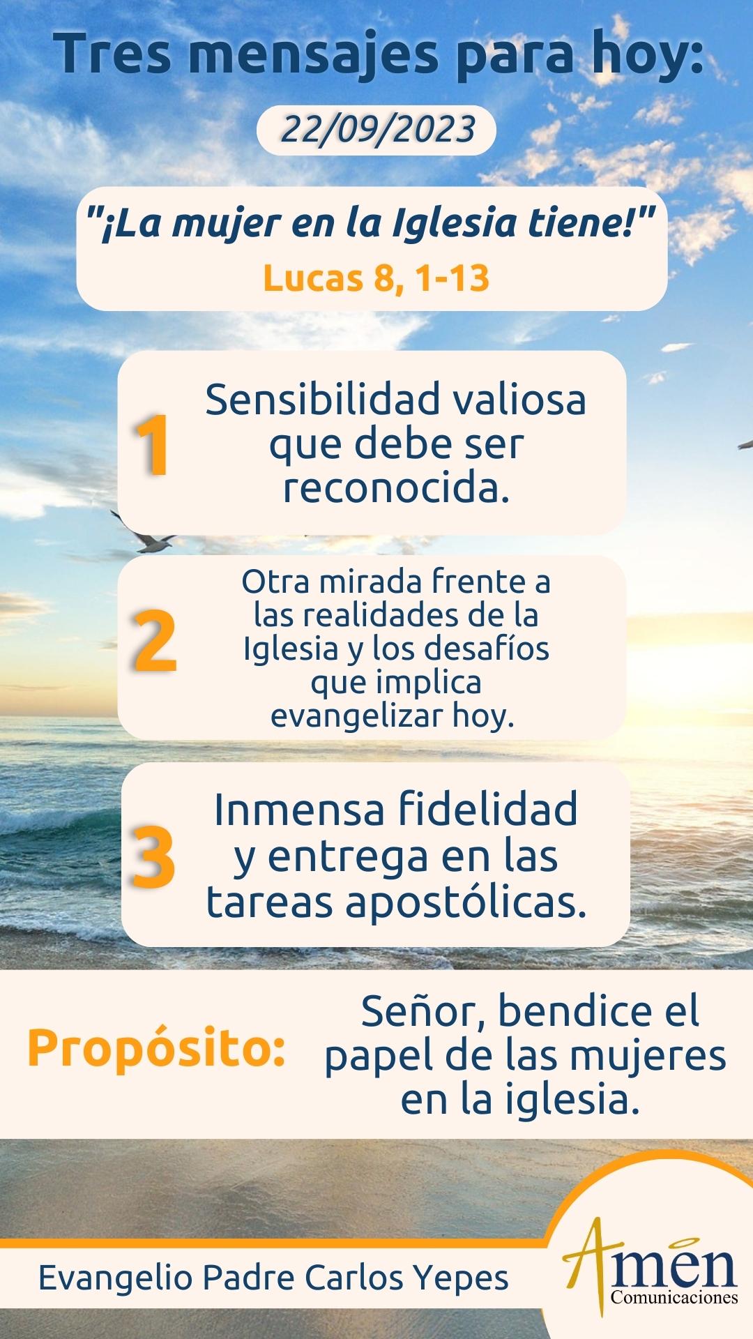 Señor, te damos gracias por la vida de María Magdalena, de Juana mujer de Cusa, de Susana, de la misma María, la Virgen Santísima Madre de Dios, hoy reconocemos esta tarea y decimos, la Iglesia tiene una deuda con la sensibilidad, con la mirada diferente y con la gran capacidad de servicio en generosidad y fidelidad que tiene la mujer para evangelizar.