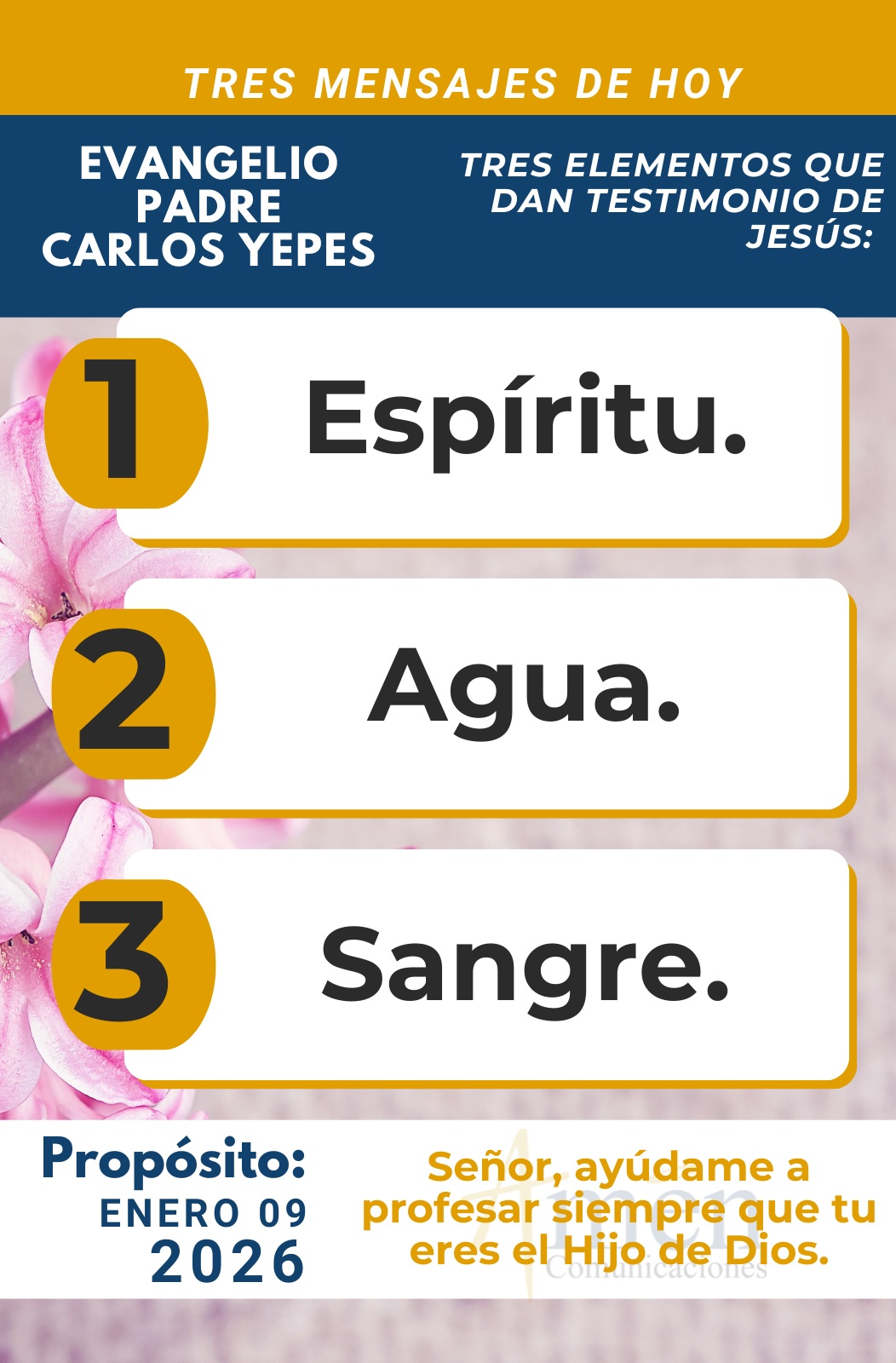 Hoy se nos presenta san Juan dándonos un mensaje hablando de que son tres los elementos que dan testimonio de Jesús, de que Él es el Mesías, el enviado por Dios. Y habla del Espíritu, el agua y la sangre.