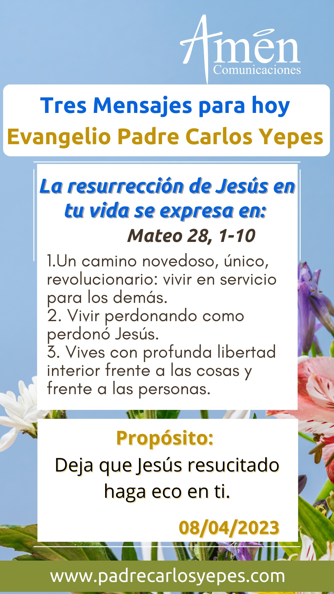Aprende este camino de Pascua, aprende este sendero de resurrección, aprende a vivir con profunda libertad interior frente a las cosas y frente a las personas. Solo cuando el Resucitado entra a mi vida, cuando me lleva a mirar las personas, las situaciones de mi diario vivir de otra manera, dejaré tantas esclavitudes, tantos esquemas mentales que me oprimen, tantas situaciones emocionales que me deprimen y me bajan de nota y de ánimo, aprende a vivir en libertad. En un cuarto camino, tú decides, si vives para los placeres de carne; para comer (la gula), para solo estar tirado en una cama (la pereza), para tus hormonas (la lujuria) y te vuelves un esclavito, un miserable de la comida, del bienestar, de las hormonas, de la lujuria, o tú decides vivir, de una manera nueva para valores más altos, ¡el amor, la alegría, la paz, la esperanza, la libertad!