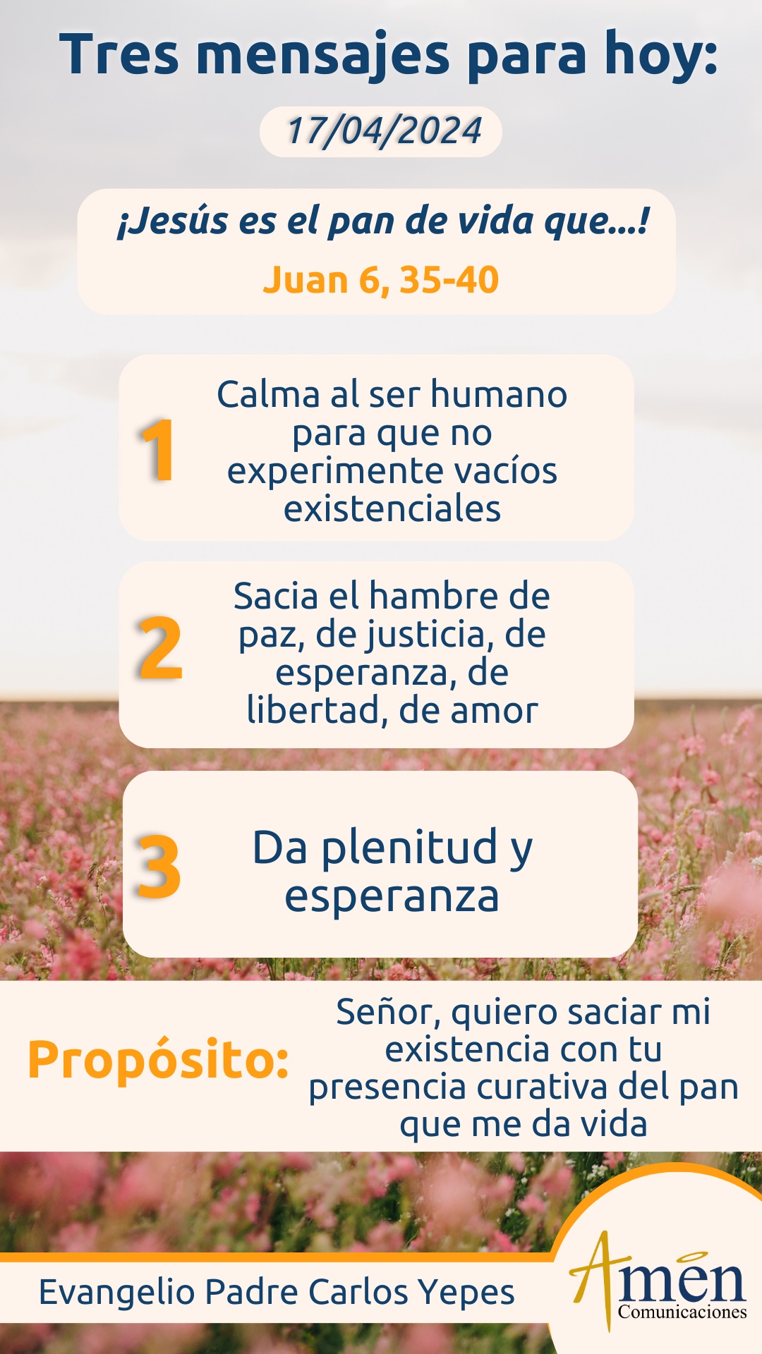 Pero Jesús avanza en su reflexión y dice que: “No ha venido al mundo para hacer su propia voluntad, sino la voluntad del Padre que lo ha enviado, que no es nada distinto que nadie se pierda, que la salvación sea para todos, que no haya la muerte eterna para nadie”. Esa es la voluntad del Padre Dios, una expresión que todos conocemos en palabras del evangelista san Juan: “Que aquel que conoce al Padre y conoce al Hijo, (esto es, lo experimentan), tengan una vida con sentido, una vida con plenitud, una vida con libertad, una vida con paz”. Recuérdalo: calidad de vida no es solamente un automóvil moderno, una moto de más cilindraje, un teléfono móvil o celular de última generación, un apartamento más grande, una casa de campo en las afueras de tu ciudad. Calidad de vida es alegría, gozo, paz, esperanza dentro de ti; no busques la plenitud de tu vida fuera de ti, en las cosas del mundo, porque quedarás defraudado. Busca la plenitud de la vida en lo profundo de tu corazón, donde habita, te habita el Señor Resucitado.