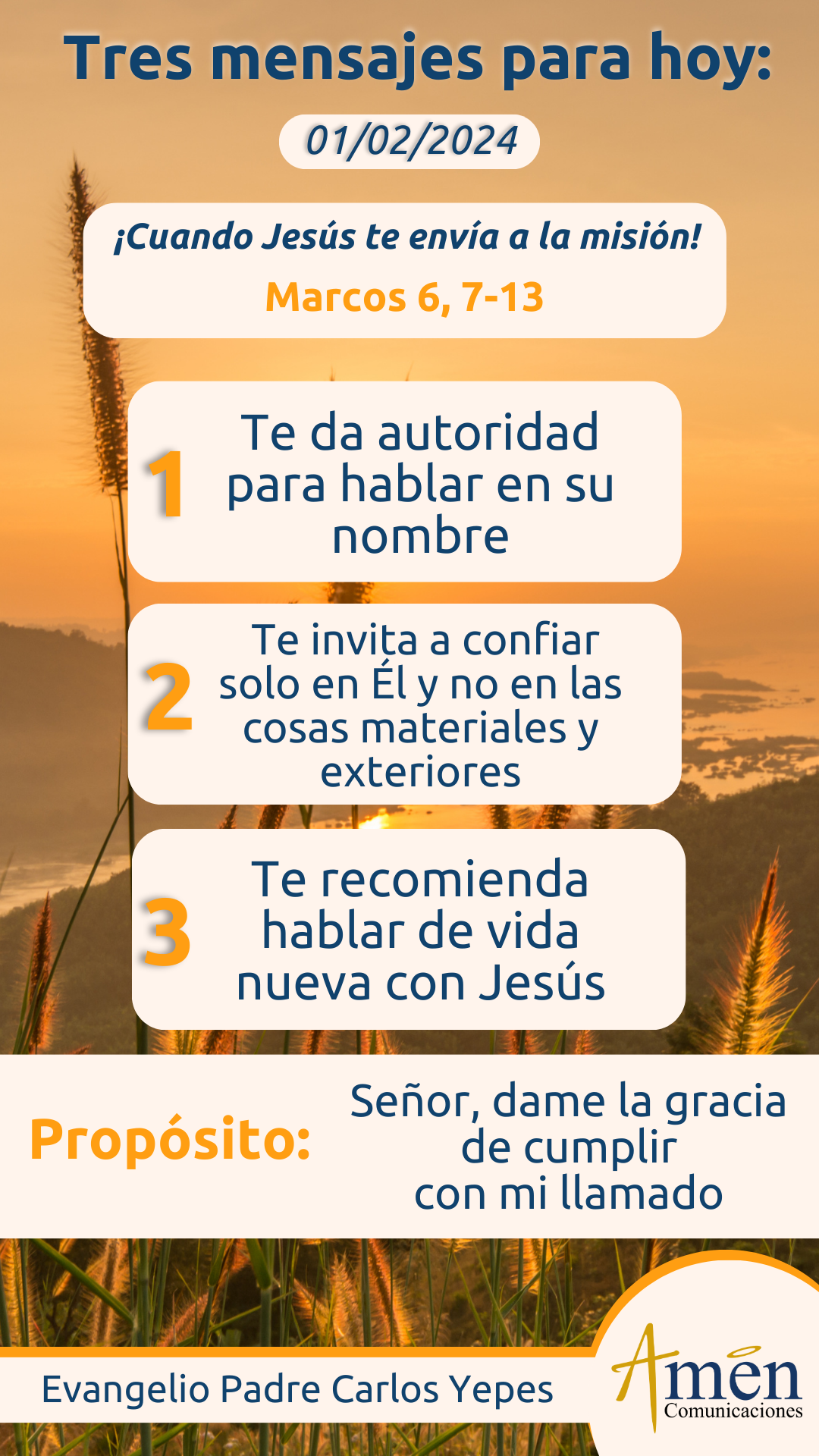 En aquel tiempo, llamó Jesús a los Doce y los fue enviando de dos en dos, dándoles autoridad sobre los espíritus inmundos. Les encargó que llevaran para el camino un bastón y nada más, pero ni pan, ni alforja, ni dinero suelto en la faja; que llevasen sandalias, pero no una túnica de repuesto. Y añadió: