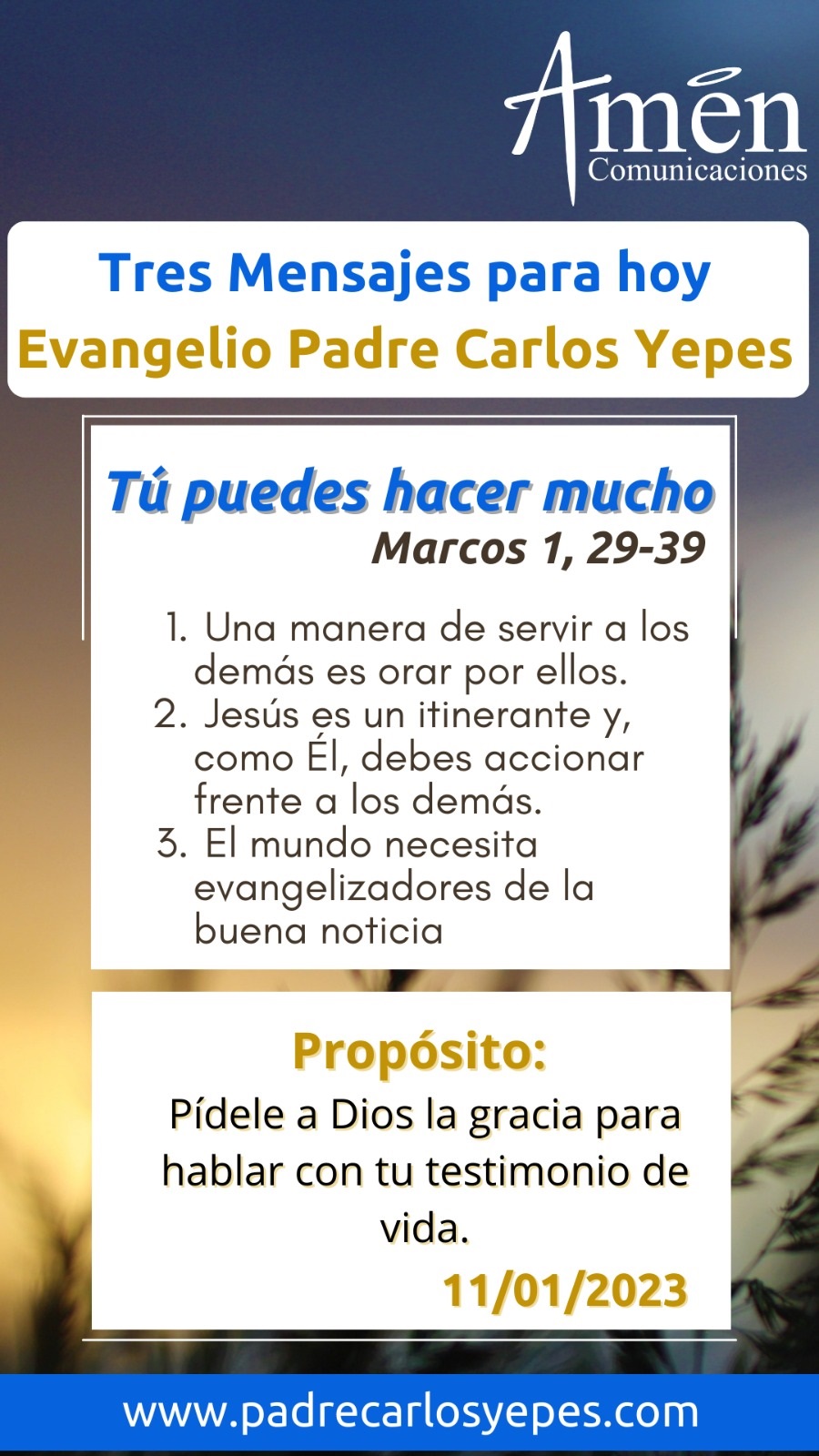 Hoy te decimos Señor: danos la gracia de conocer la forma como Tú extendiste el Reino de los cielos, no permitas que nos silenciemos los labios, por falsos respetos humanos, no permitas que, entre nuestros amigos en el almacén, la oficina, la fábrica, que, en nuestra familia, hablemos con nuestro testimonio de vida, con nuestras palabras y con nuestra oración, de lo que Tú Jesucristo, has hecho en nosotros.