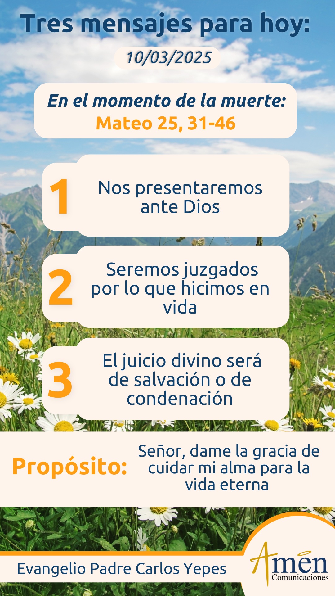 Señor, algún día será el término de nuestra vida, ¿en 30 años?, ¿en 3 semanas?, ¿en pocas horas?; solo Tú lo sabes. Dame la gracia, dame la sabiduría, dame la iluminación interior de saber que mientras que esté en esta vida puedo prepararme, disponerme para el momento definitivo del juicio ante Ti, con las obras de amor, de fe y de esperanza que supe practicar con los más necesitados de esta tierra.