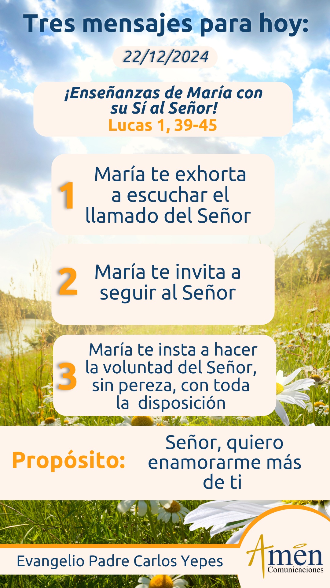 TRANSLITERACIÓN REFLEXIÓN PADRE CARLOS YEPES Los evangelios de estos últimos días del Adviento, justo antes de la Navidad, tienen un profundo acento mariano. Es que no podemos entender la Navidad del Niño, del Hijo, sin la maternidad de la Madre, de María. Claramente la carta a los hebreos en el capítulo 10, hoy nos habla de la obediencia irrestricta de Jesús a la voluntad del Padre, obediencia que también reproduce María a la voluntad del Padre Dios. Los hebreos nos dirán: “Primero Tú dices que no quieres sacrificios, ni ofrendas, ni holocaustos”. Después añades: “He aquí que vengo para hacer tu voluntad” (niega lo primero, los sacrificios, los holocaustos, las víctimas expiatorias para afirmar lo segundo). Nos quiere mostrar que para Dios lo más importante no es la ritualidad religiosa, sino que la mayor ofrenda espiritual y de nuestra vida que podemos hacer a Dios, es el consentimiento a su proyecto, la obediencia de nuestra voluntad. Cuántas veces sentimos que la voluntad de Dios va en contravía de nuestros criterios humanos, que nos cuesta, que nos parece contradictoria, sin embargo, estamos llamados a asumir esa voluntad como la más grande ofrenda espiritual que podemos realizar en nuestra vida. No fue otra la actitud de la Virgen Santísima, según nos relata el evangelista Lucas, cuando María, después de ser anunciada como la Madre del Señor, como la llena del Espíritu Santo nos dice Lucas: “Se levanta en una actitud de estar en plena disposición, se pone en camino, (lo propio de cualquier discípulo) lo hace a prisa, esto es, con toda la fuerza de su corazón, y se encaminan a las montañas de Ein Karem, donde Zacarías e Isabel”. Allí en el encuentro de dos madres, unas maternidades imposibles, María una Madre virgen e Isabel una madre estéril, allí se encuentran, y nos dice el evangelista: “Que la criatura saltó de gozo en el vientre de Isabel y que ella, junto con su niño, con su bebé por nacer, se llenaron del Espíritu Santo”. Nace precisamente de esta llenura del Espíritu de Dios en Isabel, la expresión que dirige a María: ¡Bendita tú entre las mujeres y bendito el fruto de tu vientre” !, (hablando de Jesús). Y ella reconoce la altísima misión que tiene la Santísima Virgen María al afirmar, ¿quién soy yo?, “una pobre, una vieja, una mujer sencilla” ¿para qué me visite la Madre de mi Señor y de mi Dios? Isabel, llena del Espíritu, reconoce la verdad de la misión altísima que ha recibido María. Y María, aunque en principio tuvo temor y preguntó ¿cómo será esto de la maternidad?, luego nos dice: “Que se levanta, se pone en camino y de prisa realiza su tarea de servir a su parienta Isabel en el tránsito final del embarazo y del próximo parto”. Hoy reconozcamos que María es modelo de respuesta en el llamado, en la misión que Dios nos encomienda a cada uno de nosotros y que nos invita, uno, a levantarnos como lo hizo María, a dejar nuestra realidad de meros espectadores de la vida, para volvernos protagonistas de la misma, a ponernos en camino como es la actitud de todo discípulo, caminar tras los pasos del Señor y hacerlo a prisa, sin pereza, sin temor, sin incertidumbres, porque sabemos que los trabajos por el Reino de Dios exigen toda nuestra energía, exigen toda nuestra disposición. Finalmente, la Virgen es reconocida como la Bienaventurada por parte de Isabel, porque ha creído en las palabras y promesas que Dios ha hecho para su vida. Hoy te pregunto ¿crees tú la promesa de bendición que Dios tiene para ti?, ¿sabes sobreponerte más allá de la tormenta que estés viviendo en tu vida?, ¿sabes reconocer la acción de Dios y la misión que te pone en tu familia, en tu trabajo, con tus cercanos, con tus amigos? Aprendamos a decir como María: “Que se haga en mí, según tu palabra”. Que el buen Dios te bendiga abundantemente en este día, en el nombre del Padre, y del Hijo, y del Espíritu Santo. Amén.