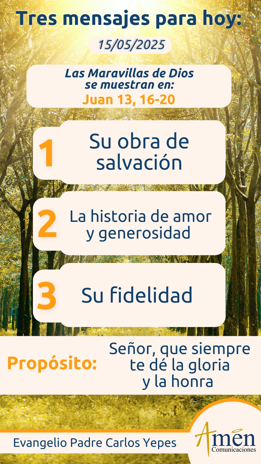 TRANSLITERACIÓN REFLEXIÓN PADRE CARLOS YEPES La primera lectura tomada del Libro de los Hechos de los Apóstoles en el capítulo 13, nos muestra el discurso inaugural de la actividad apostólica de Pablo. Comienza el apóstol dirigiéndose a los judíos invariablemente como que ellos son los primeros llamados a recibir el anuncio de la Buena Noticia de salvación. Pero no se quedará solamente en los judíos, sino que ellos serán el puente para extender este mensaje a nosotros, los no judíos, la Iglesia de los gentiles. El discurso de Pablo comienza como el de Esteban en su momento, con una síntesis de la historia de salvación que confluirá en Jesús. En efecto, nos dice que Pablo, en la sinagoga, puesto en pie y en un ademán por demás solemne, pide que todos hagan silencio y dirá a los judíos, israelitas y los que temen a Dios escuchen: “El Dios de este pueblo eligió a nuestros padres y multiplicó al pueblo en descendencia cuando vivían como forasteros y esclavos en Egipto, los liberó de allí con brazo poderoso, los condujo por unos 40 años en el desierto, cuidándolos, y los llevó a la tierra de la promesa, la tierra de la herencia, la tierra de Canaán. Todo esto aconteció en un espacio de 450 años”. Y luego, continuando con la historia salvífica, la historia liberadora del pueblo de Dios, afirmará Pablo: “Que les dio jueces, profetas como Samuel, reyes como Saúl, y luego suscitó un rey como David, resaltando que encontré a David hijo de Jesé, hombre conforme a mi corazón, y luego de la descendencia de David sacará un salvador para Israel, Jesús, del cual Juan el Bautista predicó un bautismo de conversión y del cual dijo humildemente que Jesús era tan grande el que estaba por venir, que Juan el Bautista ni siquiera merecía desatarle la correa de las sandalias de los pies”. Este anuncio abreviado de la historia de salvación, que, en su momento, también la hace el apóstol Pedro, nos muestra cómo es importante entender nuestras raíces en el judaísmo y entender que Jesús nace judío, vive judío. Y podríamos decir que, hasta el final, en la agonía de su existencia, muere como judío, pero va inaugurando en semilla, en ciernes un mensaje revolucionario que rompe radicalmente con el legalismo, el formalismo, la exterioridad, la ritualidad de las leyes judías religiosas de su tiempo. Y nos habla de una religión nueva en espíritu y en verdad, de una religión que se construye a partir de la sinceridad del corazón, de una religión que habla de un amor compasivo que acoge al enemigo, que reza por el perseguidor que perdona 70 veces siete, un amor entregado por los demás. En eso Jesús toma distancia radical del judaísmo que hablaba de: “Ojo por ojo, diente por diente”, y que pedía a Dios en el Antiguo Testamento venganza máxima contra sus enemigos y detractores. Por eso, tal vez algunos pocos judíos comprendieron a Jesús, otros en cambio, lo rechazaron y fueron instrumento para su propio juicio y ejecución. Es interesante saber esto porque nosotros debemos de conocer la obra de salvación, la historia de amor consignada a lo largo de toda la Biblia, donde el Señor ha sido siempre el eternamente fiel y el hombre ha sido el eternamente infiel al amor gratuito, generoso, eterno de Dios por los hombres. Con razón el salmo responsorial de este día nos invita a: “Cantar eternamente las misericordias del Señor, a anunciar su fidelidad por todas las edades”. Y cómo este salmo 88 en la liturgia nos dice: “Mi fidelidad y misericordia lo acompañarán, por mi nombre crecerá su poder. Él me invocará, Tú eres mi Padre, mi Dios, mi roca salvadora”. Pero pasemos al evangelio de hoy de Juan en el capítulo 13, donde Jesús, de forma solemne dirá a los suyos: “En verdad, en verdad les digo (en una invitación a la humildad y a reconocer que sólo la verdad y el poder está en Jesús, en el Padre Dios). El criado (dirá Jesús) no es más que su amo, ni el enviado es más que el que lo envía”. Por eso lanzará esta bienaventuranza: “Dichosos ustedes si lo ponen en práctica”. Es simplemente reconocer que no podemos sentirnos superiores, ni mejores que nadie por ser elegidos por el Señor. Somos criados, siervos inútiles en manos del Señor, somos enviados y no mayores que aquel que nos envía. Pero en un segundo momento nos invita a cuidarnos de las traiciones, las infidelidades y anunciará, advertirá de la traición de Judas, para que nunca nos desanimemos cuando encontremos en nuestra vida personal, familiar, pastoral, evangelizadora traidores. Dirá en efecto, Jesús: “Tenía que cumplirse, según lo profetizado en la Escritura, que el que compartía mi pan me ha traicionado. Se los digo ahora a ustedes antes de que suceda, para que cuando suceda crean que Yo soy el enviado”. Que Dios nos cuide de traicionar tanto amor que Jesús nos ha dado, con tanto amor con el que nos ha salvado y redimido. Finalmente, el evangelio de hoy concluye de manera solemne, nuevamente afirmando: “En verdad, en verdad les digo que el que recibe a quien Yo envié, me recibe a Mí, y el que me recibe a Mí, recibe al que me ha enviado”. Es la actitud de acogida que tenemos que tener frente a todo evangelizador, es la actitud de todo hombre de buena voluntad, que en el fondo no puede despreciar a quien viene en nombre del Señor, porque en el fondo está despreciando al mismo Jesús. Hoy, en tu familia, entre tus amigos, ¿hay personas que miras con sospecha porque te parecen fanáticos, te parecen que se pasan de la raya, te parecen que hablan demasiado del evangelio? Mira si eres prevenido y si no has acogido a los enviados por Jesús. Pero pregúntate sobre todo tú mismo cuando has sido rechazado, cuando te dice un hijo: “Mamá, ya lo sé, deje la cantaleta, deje de poner a Dios en todo, deje de meterme a Dios entre los ojos”, ¿te está rechazando tu hijo? Quizás se cumpla en él esta expresión: “El que te recibe a ti,
