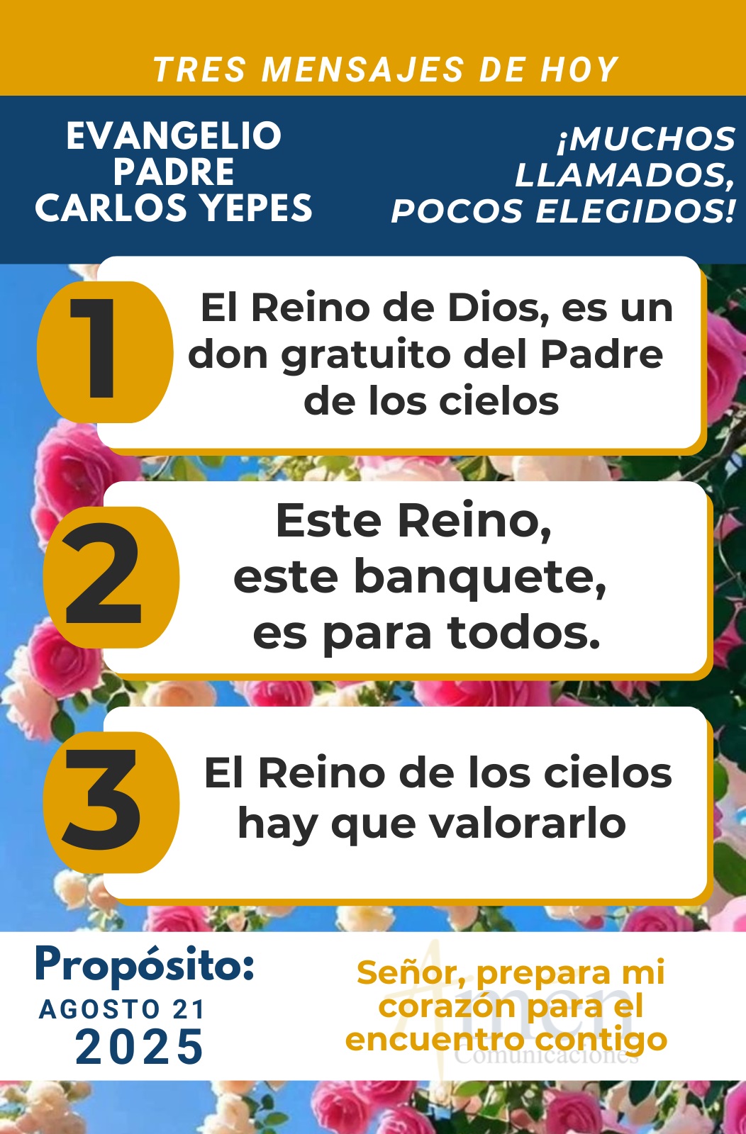 El Señor nos convoca en episodios continuos, a través de personas, a través de circunstancias, unas alegres, otras dolorosas, permanentemente el Señor nos está convocando a este banquete de la vida. Dios no se cansa de invitar al hombre a la conversión, a la renovación de su corazón, a volver su alma a Cristo. De hecho, dirá a sus criados: “Vayan a los cruces de los caminos e inviten a todos los que puedan buenos y malos, hasta que se llene el salón del banquete de bodas”.