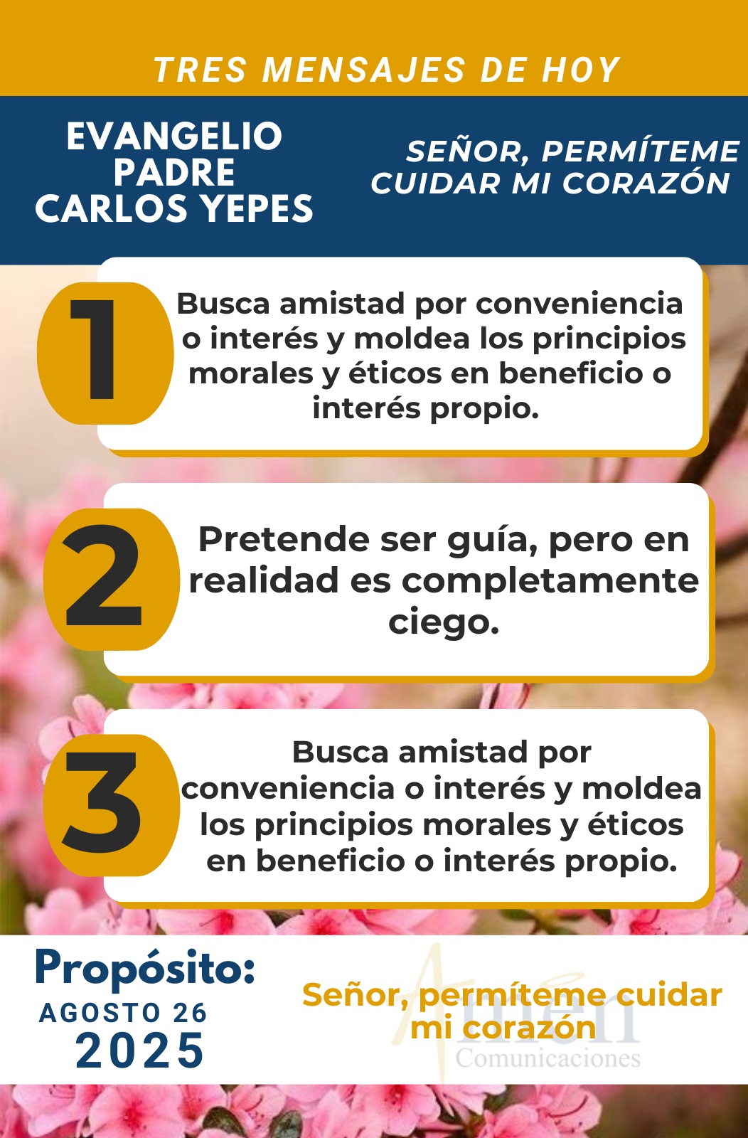 TRANSLITERACIÓN REFLEXIÓN PADRE CARLOS YEPES ¡Guías ciegos! La primera lectura tomada de la primera Carta del apóstol san Pablo a la comunidad de Tesalónica, nos muestra como el apóstol de los gentiles, Pablo, expone su actuación misionera entre todos los habitantes de esta ciudad. Les recuerda Pablo “la valentía con la que les proclamó el evangelio a pesar de las dificultades y obstáculos sufridos en su momento en Filipos, y que se repitieron en la misma ciudad de Tesalónica”, (a quienes dirige esta carta). Habla también el apóstol Pablo “de que su predicación ha sido con autenticidad. No le ha movido el lucro económico, ni ha cedido al halago de los oyentes, ni ha predicado un mensaje facilista, como lo hacían otros predicadores en su tiempo. Su fin siempre fue agradar a Dios, siendo fiel en la exposición del mensaje, sabedor de que Dios juzgará la obra misionera y que Dios es testigo de todo, aún de los pensamientos e intenciones más íntimas del corazón que permanecen ocultas a la mirada humana”. Pablo terminará defendiendo su predicación y hablando “de su desinterés total, pues pudiendo exigir en calidad de apóstol el respeto y el honor correspondientes y los subsidios económicos necesarios, se comportó con los habitantes de Tesalónica como una madre o como un papá que se olvida de sí mismo para atender a sus hijos”. Y finalizará este maravilloso ejemplo de actuación apostólica como un programa, mostrándolo “como programa para el misionero y una maravillosa reflexión para los catequizados por el reconocimiento que deben a los que proclaman el Evangelio de Jesús”. Pero continuemos nuestra reflexión a propósito del discurso contra los fariseos de Mateo capítulo 23, donde Jesús contra la veracidad que es la verdad en las palabras, y contra la sinceridad que es la verdad en la vida, se opone a los fariseos y a su hipocresía. Ellos, los fariseos, se muestran puntillosos, cositeros al momento de interpretar el precepto del diezmo anual, llegando a situaciones tan pequeñas a nimiedades como hablar de la menta, el hinojo y el comino que sirven para aromatizar una casa o condimentar la comida. Pero en cambio, estos fariseos silencian y omiten los preceptos más importantes de la ley, como son la justicia, la misericordia y la fidelidad. Cristo siempre aprobará la obediencia de la ley, pero no el legalismo, y denunciará la falta de veracidad al silenciar aspectos muy importantes de la voluntad divina. Denunciará “cómo los fariseos buscan la exterioridad, la apariencia, pero descuidan el fondo del alma donde anidan sus intenciones por demás muy torcidas”. Pero ¿qué podemos decir de toda esta reflexión?, ¿actualizarla al mundo de hoy? Podemos afirmar que la hipocresía es tan antigua como el hombre. ¿Definir a la hipocresía como falsedad, disimulo, ocultamiento de las intenciones del corazón, intenciones egoístas, intenciones ambiciosas, intenciones mezquinas? El hipócrita o el fariseo destruye las relaciones humanas porque no puede haber confianza donde no hay sinceridad. Se presentan falsos afectos, se pretenden exhibir como guías, pero en el fondo están más ciegos que aquellos discípulos a los que ellos siguen. Buscan amistad por conveniencia o interés y amoldan los principios morales y éticos en beneficio o interés propio. Ya la Sagrada Escritura con Jeremías capítulo 17 nos dirá “que nada hay más engañoso y enfermo que el corazón humano”, ¿quién lo comprenderá? Pero también la Escritura nos dirá “Bienaventurados los limpios de corazón, sin hipocresías, porque sólo ellos verán a Dios”. Pero ¿cómo limpiar el corazón?, ¿cómo no ser unos guías ciegos?, ¿cómo tener esa higiene espiritual?; ¿no sólo de la copa, del plato, no sólo del cabello, de los dientes, de los pies en la higiene personal? Te propongo algunas reglas que pueden ayudarnos a purificar las intenciones de nuestro corazón. La primera, tratemos de conocernos a nosotros mismos, con alguna profundidad, hagamos un examen de conciencia diario. ¿Qué me motiva a pensar, hablar, a decidir, a actuar de tal o cual manera? ¿Qué busco en las relaciones con los demás?, ¿hay sinceridad?, ¿hay amor, hay compasión, interés por la justicia? O ¿hay conveniencia, hipocresía?, ¿hay de alguna manera un interés oculto, egoísta y mezquino donde busco sacar provecho de los demás? Conozcámonos en la profundidad de nuestra conciencia y aprenderemos el camino de la sinceridad del corazón. Una segunda forma de limpiar el corazón y no ser guías ciegos, es dejar el vicio de juzgarlo todo, porque nos encanta “mirar la paja en el ojo ajeno, pero no la viga en el propio ojo”. Olvidamos que quien fácilmente juzga de otro, difícilmente se conoce a sí mismo y no dejamos de ser murmuradores, cositeros, llenos de prevenciones y prejuicios y así criticando de todo volvemos nuestra vida o la crítica, deporte olímpico. Pero además uno, de conocernos a nosotros mismos. Dos, de dejar el vicio de juzgarlo todo. Tres, aprendamos a ayunar de la vanidad y del orgullo, de la esclavitud, de quedar siempre bien ante los demás. Ya lo decía el pensador griego: “La falsa humildad es el orgullo del hipócrita”. A veces pensamos, hablamos, decidimos, actuamos vanidosamente. Es más, lo hacemos muchísimas veces aparentando lo que no somos, presumiendo de lo que no tenemos. De alguna manera, hablando de los viajes que no hemos realizado, de las posesiones que no tenemos. Recuerda que no eres importante por la opinión que los demás tengan sobre ti. Eres solo importante por la mirada que Dios tiene sobre tu corazón. Hoy cuando veo en las redes sociales que endiosamos una persona hoy y mañana la crucificamos, pienso qué absurdo es exponernos a darle todo el poder de nuestra vida al reconocimiento humano, al reconocimiento de los hombres. En una cuarta regla, descubramos que toda mentira, toda malicia, toda vanidad, se cae con el pa