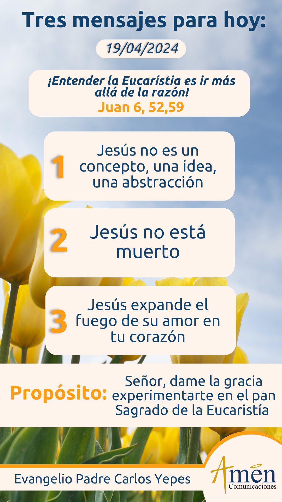 Hoy si participas de la Eucaristía, pero no comulgas por una situación irregular en tu relación de pareja, por un pecado que te da vergüenza confesar, por un reato de conciencia; busca orientación, pero no vayas solamente a la Eucaristía a escuchar, a participar a distancia y a no comer el Pan de vida porque quedas a mitad del camino. Lo más grande que nos puede pasar es celebrar la bendita Eucaristía de cada día, que es nuestra fuerza, es nuestra paz, es nuestra esperanza; sentimos que Jesús ya no es más un concepto, una idea, una abstracción, que Jesús no está muerto, no es un recuerdo diluido por allá en el pasado, sino que Jesús es una persona, un nombre concreto, y sentimos el fuego, el fuego de su amor en nuestro corazón, cuando con fe, recogimiento y consciencia, comemos el Pan de la Vida.