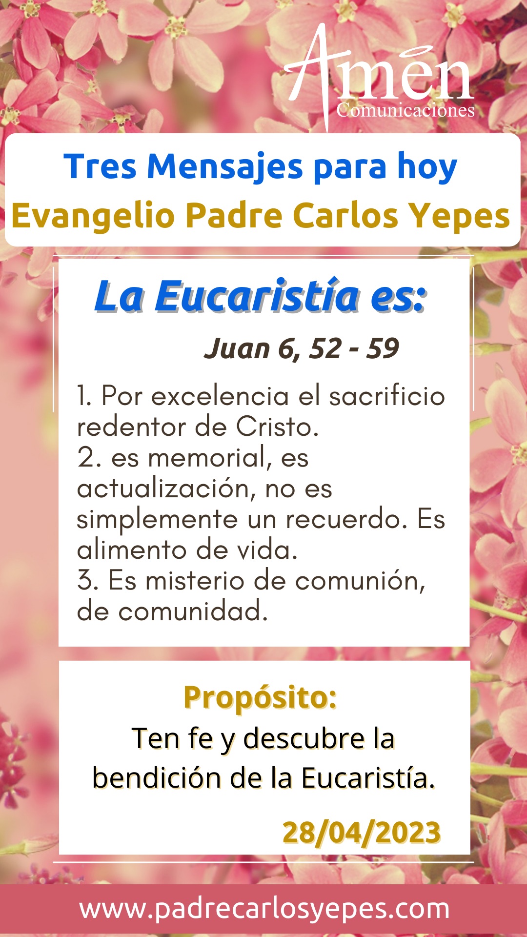 Pero hablemos, además de ese sacrificio redentor, de ese memorial y de esa comunión eclesial, hablemos de que la Eucaristía es por excelencia alimento de vida, comida de vida, pan de vida. Tú sientes cuando hay fe, que te vivificas interiormente, que te descubres resucitado, que la Eucaristía genera sentimientos que más allá de emociones, producen gozo en el corazón, paz en el alma, deseos de salir adelante, fortaleza para enfrentar las pruebas y dificultades; realmente experimentamos esto cada uno de nosotros.