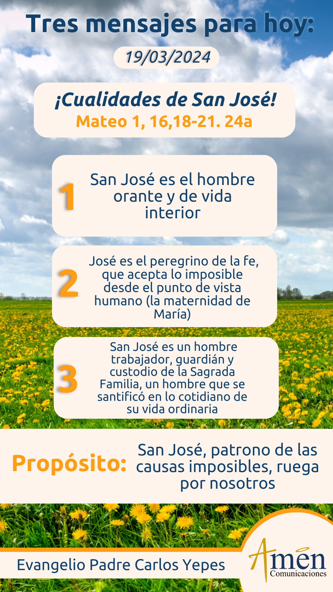 TRANSLITERACIÓN REFLEXIÓN PADRE CARLOS YEPES Con el carácter de solemnidad litúrgica, la Iglesia en el mundo entero con inmensa alegría, celebra la memoria de ¡San José!, esposo de la Bienaventurada Virgen María. Pero qué hay detrás de este personaje de quien no se conoce ninguna palabra, ni una sola expresión consignada así en los evangelios, sino que sólo nos podemos aproximar a él, a través de sus actitudes, a través de sus respuestas de vida, en su peregrinar en la fe. También nos preguntamos qué tiene San José, que bajo su custodia están los más grandes patronazgos reconocidos universalmente: patrono de la Iglesia, patrono de los trabajadores del mundo entero, patrono de los padres de familia y en general de los hogares; patrono de los moribundos y de los que están haciendo tránsito a la vida eterna, patrono de los diplomáticos por su prudencia proverbial, patrono de los que tienen sueños, porque Dios le habló siempre a través de sueños nocturnos. Patrono de la vida religiosa y los contemplativos, porque fue hombre de silencio y de vida interior; pero sobre todo reconozcamos en San José, el patrono de las causas imposibles, porque él las abrazó al aceptar a María como esposa y Madre de un hijo en el que él como hombre y desde el punto de vista natural, no había tenido, ni tuvo ninguna participación humana. Hoy reconozcamos, que más allá del año especial de San José que se tuvo hace algún tiempo, precisamente convocado por el Papa Francisco, descubramos en él tres condiciones especiales, mensajes actuales para los hombres de hoy. El primero, San José es el hombre orante, de vida interior y en una cultura de tanto ruido y superficialidad, de tantos mensajes y propaganda publicitaria, donde estamos sobre estimulados por mil imágenes y sonidos, cuánta falta nos hace tener vida interior, vida de oración, vida de reflexión, vida de escucha de nosotros mismos. Estoy convencido que un camino cierto de sabiduría humana, es la capacidad de silenciamiento interior y de que el hombre mantenga diálogos consigo mismo: sobre su origen, donde ha nacido, de dónde viene, sobre su naturaleza, quién es y sobre su destino, hacia dónde va su vida humana. Hoy nos mata la irreflexión, la superficialidad de la vida, la frivolidad en nuestras relaciones, que nos hace desacertivos en nuestros conflictos, en nuestras diferencias interpersonales. Estoy convencido que una persona de vida interior, de reflexión, de silencio, de cara a la Palabra de Dios, de cara a la oración personal, de cara a la adoración divina en la naturaleza, de cara a su Eucaristía diaria, es un hombre, una mujer más sabios, más reflexivos, más asertivos en las pruebas y desafíos que le presenta la vida. Pero hay una segunda enseñanza que nos deja San José hoy en su solemnidad litúrgica. José es el peregrino de la fe, que acepta lo imposible desde el punto de vista humano, (la maternidad de María) como decíamos al comienzo de esta reflexión, sin ninguna participación suya desde el punto de vista humano, y José acepta esto y de alguna manera nos invita a cada uno de nosotros, a entender que los planes de Dios son incomprensibles para nuestras lógicas humanas y personales, y que sólo por la fe podemos aceptar lo imposible y asumir muchas situaciones que en la vida nos parecen ilógicas. Pero José, San José, esposo de la Virgen María, es un buen modelo, un buen ejemplo, es paradigma, de aceptar y acoger desde la fe en Dios, todo lo que la vida nos va presentando. La fe es esa luz interior que te lleva a entender, que aunque desde lo humano es difícil asumir una realidad, Dios tiene planes, Dios tiene propósitos con esa situación que ahora vives, por más que te parezca absurda, por más que te parezca contradictoria y difícil con tu vida. Finalmente, reconozcamos en San José, un hombre trabajador, un hombre guardián y custodio de la Sagrada Familia, un hombre que se santificó en lo cotidiano de su vida ordinaria; ciertamente todo podemos decir de San José, menos que vivió momentos extraordinarios en su vida laboral. Allí, como artesano de la madera, como carpintero, realizó un trabajo que sirvió de manutención para María y para su Hijo Jesús; probablemente enseñó al Niño, la Torá, (la ley judía), probablemente lo acompañó en las grandes fiestas judías, especialmente en la Pascua en Jerusalén, probablemente le enseñó el respeto a Dios, el escuchar su voz y vivir en la obediencia a los mandatos divinos. Hoy, tú y yo, implorando e invocando la poderosísima intercesión de San José en su solemnidad litúrgica, pidamos ser personas de vida interior, orantes, hombres y mujeres de fe, que aceptan lo que humanamente es difícil o casi imposible de comprender y aceptar, y que seamos trabajadores que santifiquemos nuestra vida, en lo ordinario, lo cotidiano que realizamos, guardando, acompañando nuestras familias. Con toda la fuerza de nuestro corazón digamos: San José, patrono de la Iglesia, de las familias, de los trabajadores, de los hombres, de los moribundos, de los contemplativos, de la vida religiosa, de los prudentes; San José patrono de las causas imposibles, ruega, ruega por nosotros. Que el Señor, en esta fiesta de San José, te bendiga en abundancia en tu vida, tu familia y tus proyectos, en el nombre del Padre y del Hijo y del Espíritu Santo. Amén.
