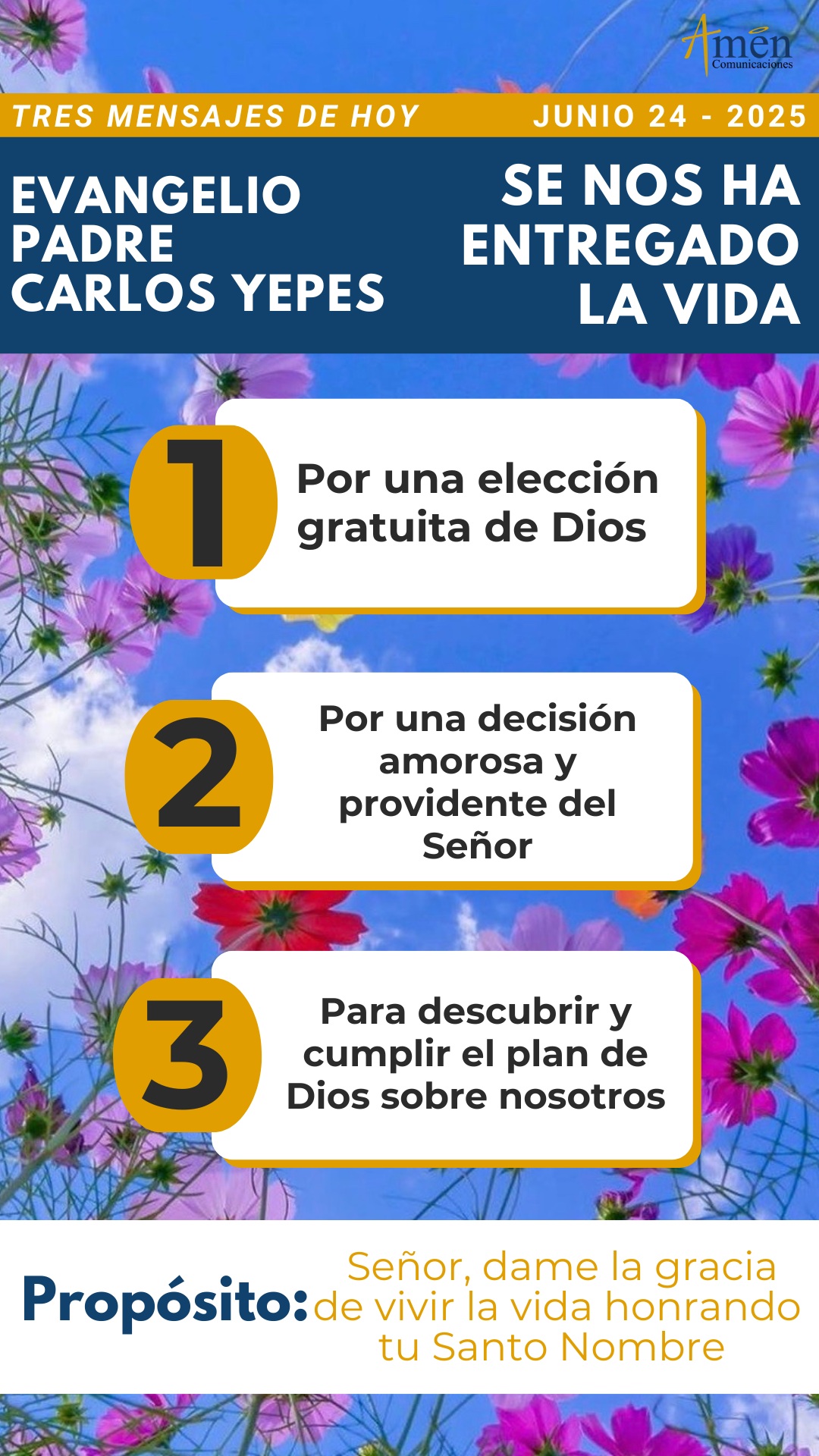 Hoy te invito para que reconozcas que tu vida y la mía sin ser la de Juan el Bautista es una vida que no se nos ha dado simplemente de manera arbitraria. Se nos ha entregado la vida por una elección gratuita, amorosa y providente de Dios y para cumplir el plan, el propósito divino, el proyecto de Dios sobre nuestra vida.