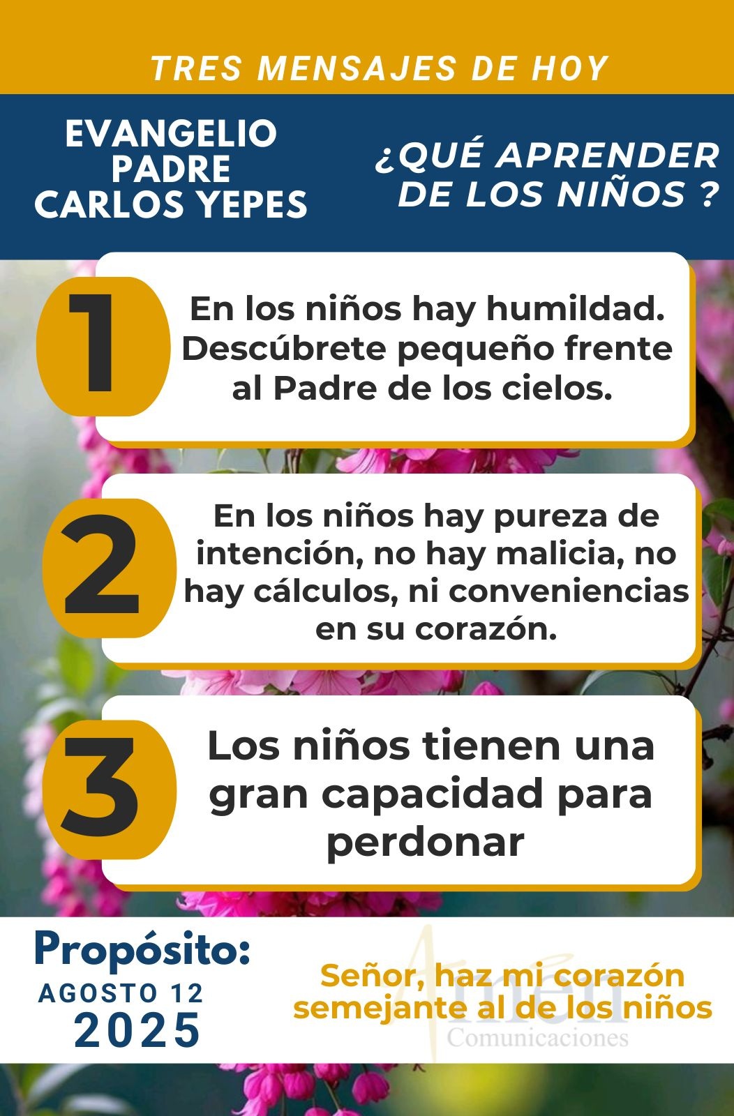 La primera, el alma de un niño es un alma humilde que reconoce su total dependencia de sus padres, que se reconoce una criatura pequeña mirando su baja estatura, mirando su desconocimiento de la vida, mirando la necesidad de la asistencia permanente y el cuidado solícito de los mayores cuando se lastiman, cuando están enfermos y en distintas circunstancias. Así nosotros debemos de sentir la humildad o experimentar la humildad de los niños y descubrirnos pequeños frente al Padre de los cielos.