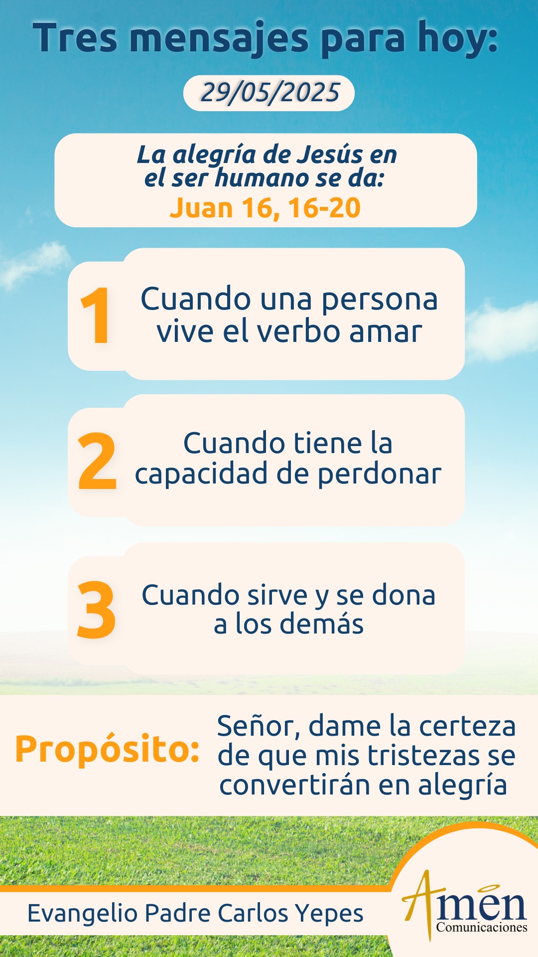 TRANSLITERACIÓN REFLEXIÓN PADRE CARLOS YEPES El libro de los Hechos de los Apóstoles nos presenta a Pablo que ha dejado la ciudad de Atenas y se dirige camino a Corinto, se hace amigo de Aquila y de su mujer Priscila, y comparten un trabajo en común, tejedores de lona para tiendas de campaña, sin embargo, no deja su tarea apostólica. Y nos dice el libro de los Hechos de los Apóstoles: “Que todos los sábados, (el día sagrado para los judíos), discutía en la sinagoga, esforzándose por convencer a judíos y griegos”. Pablo se dedicó enteramente a predicar, dando testimonio ante los judíos, de que Jesús es el Mesías, el esperado y el anunciado por los profetas, y aunque entre los suyos los judíos no lo aceptan, Pablo al final, lejos de desanimarse, se declara inocente de la terquedad de su pueblo y dirige, enfoca toda su predicación al mundo gentil, al mundo pagano, al mundo de los no creyentes. Pero destaquemos del evangelio de hoy, en esta línea de la despedida de Jesús de sus discípulos cuando les dice: “Dentro de poco ya no me verán, pero dentro de otro poco me volverán a ver”, los discípulos encuentran ambigüedad en estas palabras y no alcanzan a entenderlas. Y Jesús, explayándose en explicaciones afirmará: “En verdad, en verdad les digo, ustedes llorarán y se lamentarán por mi partida, mientras el mundo estará alegre”. ¿Qué nos quiere decir Jesús con esta expresión?, el mundo y el cristianismo son como el agua y el aceite, chocan y se excluyen recíprocamente. Tú lo puedes comprobar en tu vida cotidiana, ves que una persona creyente tiene unos valores, una forma de pensar, de mirar, de relacionarse con los demás totalmente distinta del hombre o de la mujer, paganos o no creyentes. Por eso el verdadero discípulo se alegra de leer la Palabra, de orar a Dios, de celebrar la fracción del Pan o la Eucaristía, de servir desde la forma evangélica de la caridad de Cristo, y al contrario, el no creyente vive de manera egoísta, narcisista, para sí mismo, es incapaz de entender el valor de la oración, el poder de la Eucaristía, el por qué su pareja, un familiar, un hermano, creen, es más, te reprochan. Repetimos, agua y aceite se excluyen, y fe cristiana, y fe en el mundo también se excluyen, por eso llorarán los creyentes en Jesús, mientras el mundo se alegrará. Pero quizás lo más interesante de esta reflexión es la parte final de la misma, cuando Jesús dice a sus discípulos: “Ustedes por mi partida temporal estarán tristes”, ¡pero ánimo, su tristeza se convertirá en alegría! Hoy nos dice a cada uno de nosotros, cuando Jesús pasó por esta tierra hace dos mil años, y nos dejó su Espíritu Santo, que a veces sentimos nostalgia porque Dios no se manifiesta de manera más fuerte, más viva, más real en el mundo, sentimos un poco de desánimo, de desconcierto, de tristeza, pero luego nos hace una promesa: “Su tristeza se convertirá en alegría”. Y de aquí podríamos aprender grandes enseñanzas para nuestra vida. La primera, la alegría más profunda de la vida, está cuando tienes a Dios dentro de tu corazón. No hay alimento, no hay comida, no hay paseo, no hay placer de las hormonas, de los sentidos, no hay experiencia en el mundo que de lejos se equipare, al gozo profundo de tener a Dios en tu corazón, a Jesús en comunión profunda contigo. Y esa vida nueva de Jesucristo en nosotros, se manifiesta a través de caminos o mejor, de verbos, de acciones muy puntuales. En definitiva, la alegría de Jesús en nosotros se da, uno, cuando vivimos en nosotros el verbo amar, nos sentimos gozosos y plenos. Dos, cuando tenemos la capacidad de perdonar; cuánta paz en el corazón humano, cuando verdadera y totalmente perdonamos y no llevamos memoria de las ofensas que otros nos han causado. Tres, cuando servimos, nos donamos, nos entregamos a los demás. Es que la alegría de la vida no está en vivir para sí mismos, sino en vivir en servicio para los demás. Cuatro, cuánta alegría profunda hay en nosotros cuando compartimos. Es que los bienes de esta tierra se disfrutan doble, triplemente, cuando los compartes con los demás, cuando tu vida, no en solitario, sino en una verdadera apertura hacia los demás, la compartes con los otros. Cinco, descubre la gran alegría de la vida en orar al Padre Dios, en sentirte en amistad, en amor de intimidad con Él, en descubrir que no estás solo y que, por el contrario, hay una realidad que te trasciende, que te supera, que es infinitamente más grande que tú, pero que es mucho más poderosa, amorosa, bondadosa y que te guía y te llena de confianza. Mira como son las alegrías en Dios y por eso tu aparente tristeza por la falta de Cristo, se convertirá en alegría por la presencia del Espíritu Santo, que es Dios en mí y me invita a amar, a perdonar, a servir, a compartir, a orar y a entender, en definitiva, que solo hay verdadera vida, cuando doy vida a los demás. Que el Señor, que es rico en misericordia y en amor, bendiga este día de tu vida abundantemente. En el nombre del Padre, y del Hijo, y del Espíritu Santo. Amén.