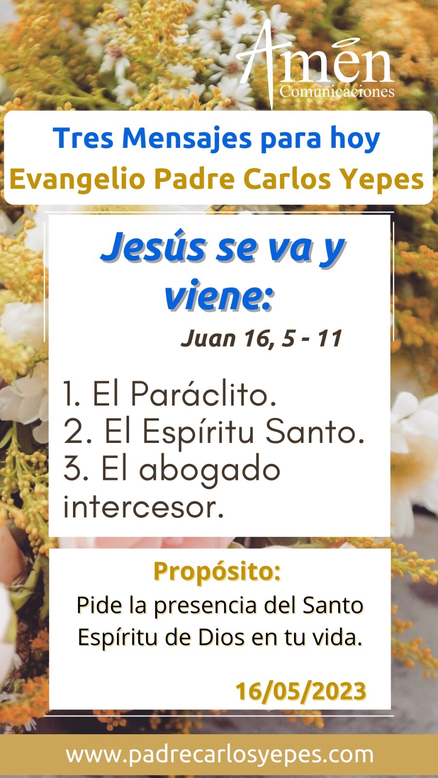 En aquel tiempo, dijo Jesús a sus discípulos: «Ahora me voy al que me envió, y ninguno de ustedes me pregunta: “¿Adónde vas?”. Sino que, por haberles dicho esto, la tristeza les ha llenado el corazón. Sin embargo, les digo la verdad: les conviene que yo me vaya; porque si no me voy, no vendrá a ustedes el Paráclito. En cambio, si me voy, se lo enviaré. Y cuando venga, dejará convicto al mundo acerca de un pecado, de una justicia y de una condena. De un pecado, porque no creen en mí; de una justicia, porque me voy al Padre, y no me verán; de una condena, porque el príncipe de este mundo está condenado».
