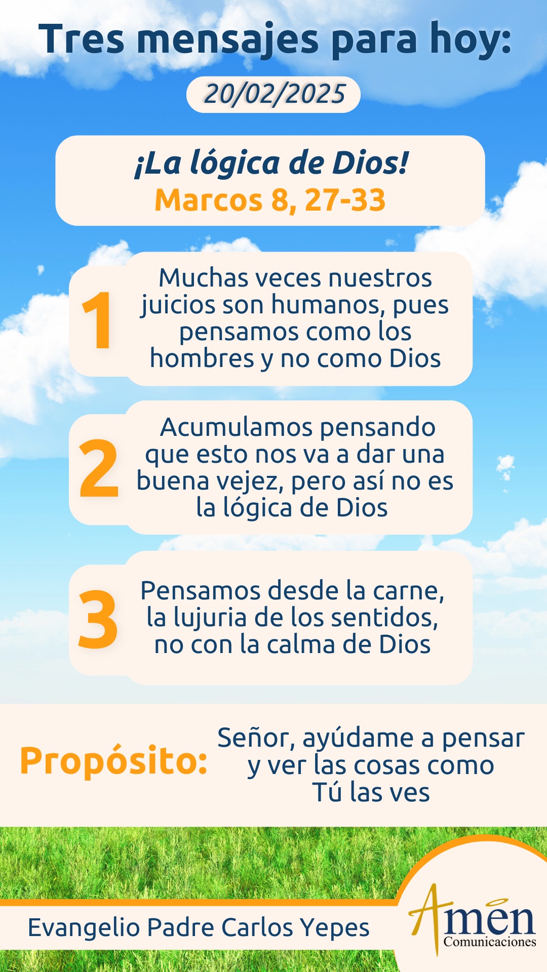 Hoy detengámonos en esta afirmación y pensemos cuántas veces nuestros juicios son tan humanos, hablamos de venganza, de retribución, le decimos a eso justicia, no conocemos la experiencia del perdón y por eso pensamos como los hombres, no como Dios. Pensamos a veces en ganancias, en utilidades, en ventajismo sobre otros, en la primacía en la familia, en la empresa, por intrigas, por triquiñuelas, por trampas, por ambiciones humanas, laborales, económicas y profesionales y por eso pensamos como los hombres y no como Dios. Pensamos en acumular, atesorar, guardar, pensando que esto nos va a dar la seguridad para la vejez y la hora final, y estamos pensando como los hombres, no como Dios. Pensamos a veces tanto desde la carne, la emulación, el gusto por la comida, la lujuria de los sentidos, las pasiones desbordadas, la hora loca de la vida, la vida loca podríamos decir, pensamos como los hombres, no como Dios, que sabe que nuestra vida tiene término. Finalmente podríamos decir, que rehuimos toda la vida la enfermedad, el sufrimiento, la soledad, cualquier situación que nos escandalice porque nos genera desánimo, cansancio, porque no genera bienestar en nosotros y rehuimos cualquier expresión de cruz, sacrificio, compromiso, exigencia, disciplina, ascesis en la vida, pensamos como los hombres, no como Dios.