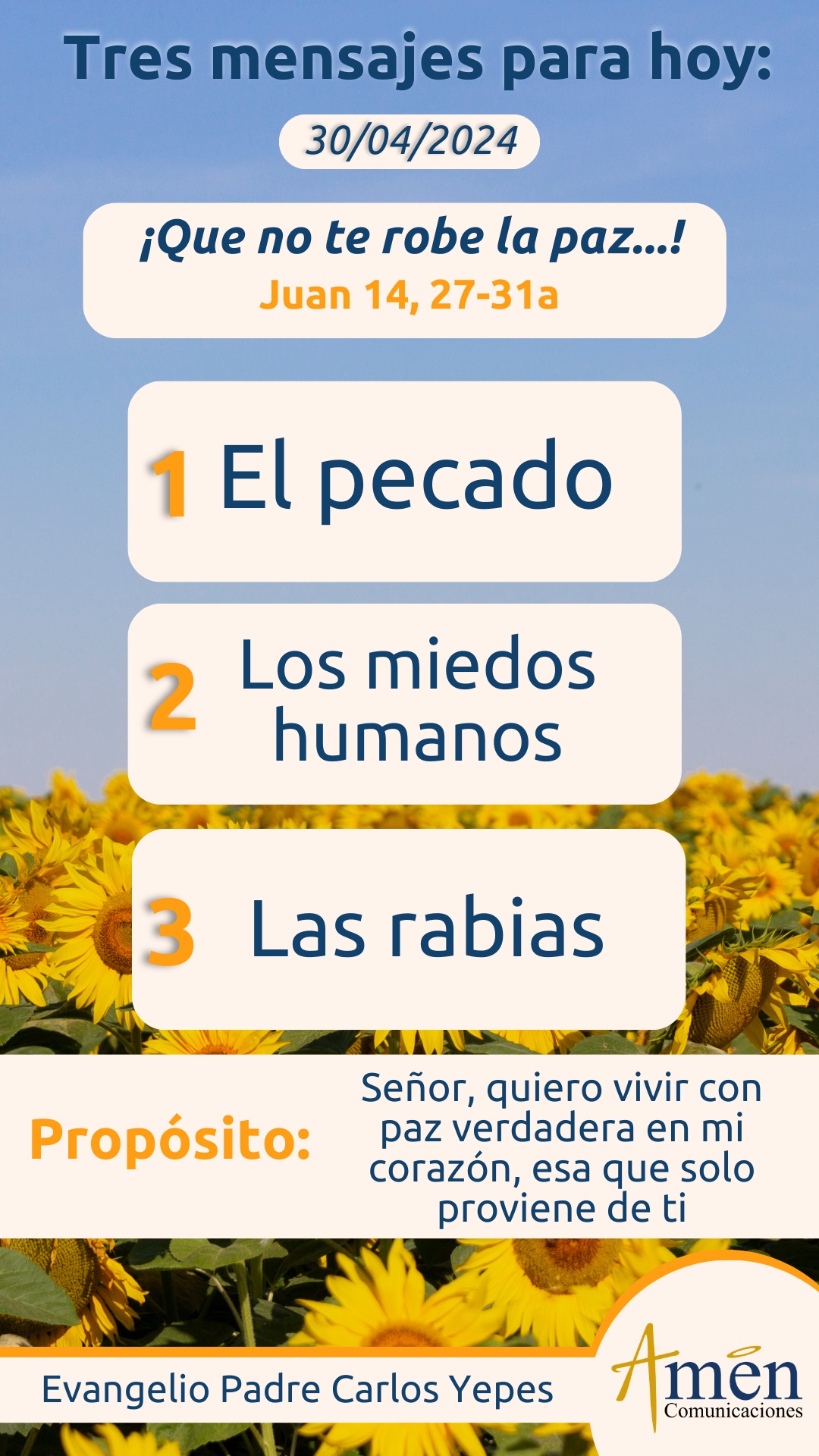 Hoy pregúntate: ¿por qué has perdido la paz de tu corazón?, ¿para qué un carro nuevo, para qué una casa más grande, para qué comer rico en ese restaurante famoso si en tu corazón no hay paz? Recuerdo un viejo adagio que decían las abuelas: “Quien ha perdido dinero en la vida ha perdido mucho, quien ha perdido la salud ha perdido demasiado, pero quien ha perdido la paz del corazón, lo ha perdido todo”. No te dejes robar la paz del corazón, hoy Jesús te la da, así empieza el evangelio: “La paz les dejo”, y luego precisa cuál paz nos quiere dejar y dice: “Mi paz les doy”, es una paz que es don, es una paz que se entrega permanente, es una paz que acontece en un eterno presente; no dejes que el pecado del mundo, los miedos humanos, las rabias y la manipulación ideológica que es uno de los grandes signos del siglo 21, te hagan instrumento del odio, de los prejuicios de otros. Somos hermanos todos, somos la religión del amor, nos hablan de un pasado, no nos interesa si hubo errores o no, nos interesa el presente, lo único cierto que tenemos, y en ese presente Jesús nos dice: “La paz se da por la fuerza de la justicia, por el poder del amor, por la entrega en el servicio, la entrega de la vida cada día”. ¡No lo olvidemos, no te dejes robar la paz de tu corazón!
