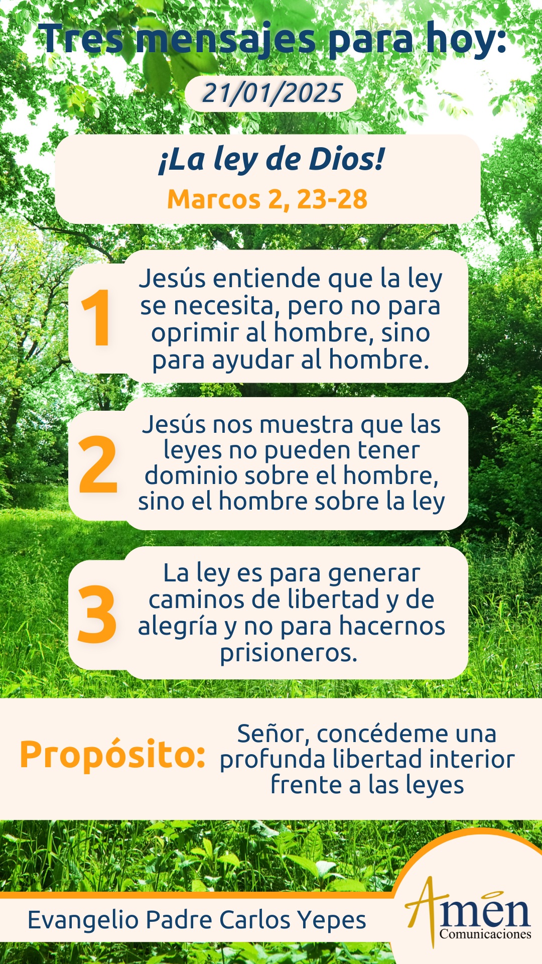 Hoy nos preguntamos ¿cuántas leyes realizan verdaderamente la justicia a favor del hombre?, ¿la caridad y el amor a favor del hombre, el servicio y la misericordia a favor del hombre? O por el contrario, ¿tenemos ese concepto muy de los romanos, dura es la ley, pero es la ley? Somos nosotros mismos los creadores de una ley que nos aprisiona, que nos humilla, que nos esclaviza, que nos llena de miedos frente a la eventualidad de prohibirla y frente a la cual podemos ser castigados, censurados socialmente o aún condenados con penas privativas de la libertad. Todo el concepto de ley para un judío es completamente distinto del criterio de ley que manejamos los hombres en el mundo occidental. La ley es para facilitarle la vida a los hombres, no para complicársela, la ley es para generar caminos de libertad y de alegría y no para hacernos prisioneros en nombre de una supuesta norma que está establecida para el bien común, pero que termina yéndose contra el propio hombre. Las leyes se necesitan, de lo contrario seríamos anárquicos y no se trata de eso, pero la ley fundamental que Cristo vino a traer al mundo con su mensaje fue la ley de libertad, la ley del amor, la ley del servicio a los demás.