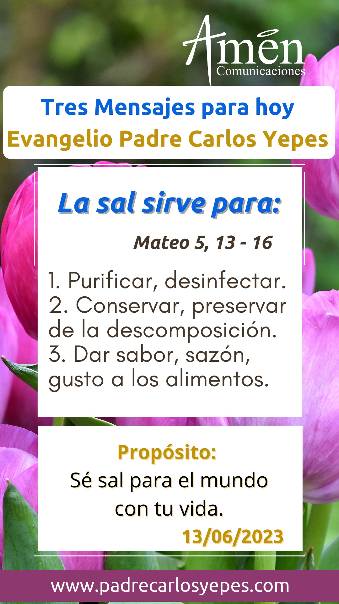 En efecto nos habla de la sal y de la luz y del poder inmenso y transformador que hay en ellos, que aun concentrados esto es en pequeñas cantidades, como logra dar sabor un poco de sal, o como logra iluminar un poco de luz. La sal es tan potente que no se come sola, sólo sirve saliendo de sí misma, sólo sirve disolviéndose, entregándose en otros alimentos evitando el protagonismo; y la sal tiene tres funciones, purificar, desinfectar las heridas así duela; tiene una segunda función, conservar, preservar de la descomposición, y en el antiguo testamento la sal era signo de la alianza. De hecho, cuando se hacía un convenio o pacto, se echaba encima sal para asegurar que se respetaba y se conservaba ese pacto o convenio. Pero también la sal en un tercer momento, sirve para dar sabor, sazón, gusto a los alimentos; entendida la sal de esta manera, nos invita a purificarnos del pecado, del veneno del mundo, a desinfectar las heridas de nuestra alma.